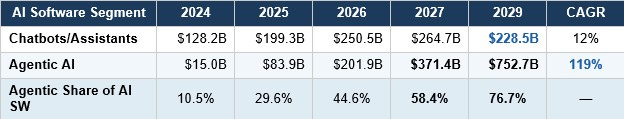 AI 代理 將以119%的複合年增長率成長,到2029年達到7,527億美元。