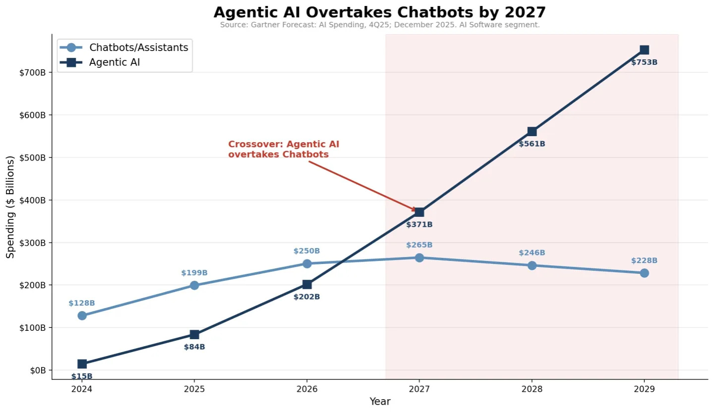 到2027年,AI 代理 的支出將超過 聊天機器人/助理。聊天機器人的支出將達到2,647億美元的高峰後開始下降。